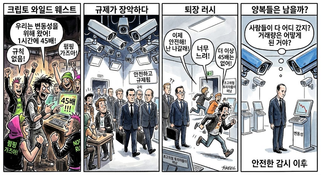 크립토가 증권 거래소를 닮아가고 있다. 감시 카메라가 늘어나고, 양복 입은 기관 고객들이 들어오기 시작했다. 그런데 원래 그 자리를 채웠던 손님들은 “안전하니까” 온 게 아니다. “1시간에 45배가 터지니까” 왔다.