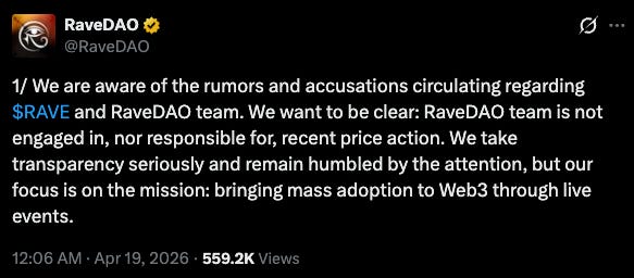 Binance and Bitget then launched investigations, and RAVE collapsed from $26 to $1, a 90% drop. $5.7B in market cap was erased in a single day. RaveDAO pushed back, claiming no team involvement.