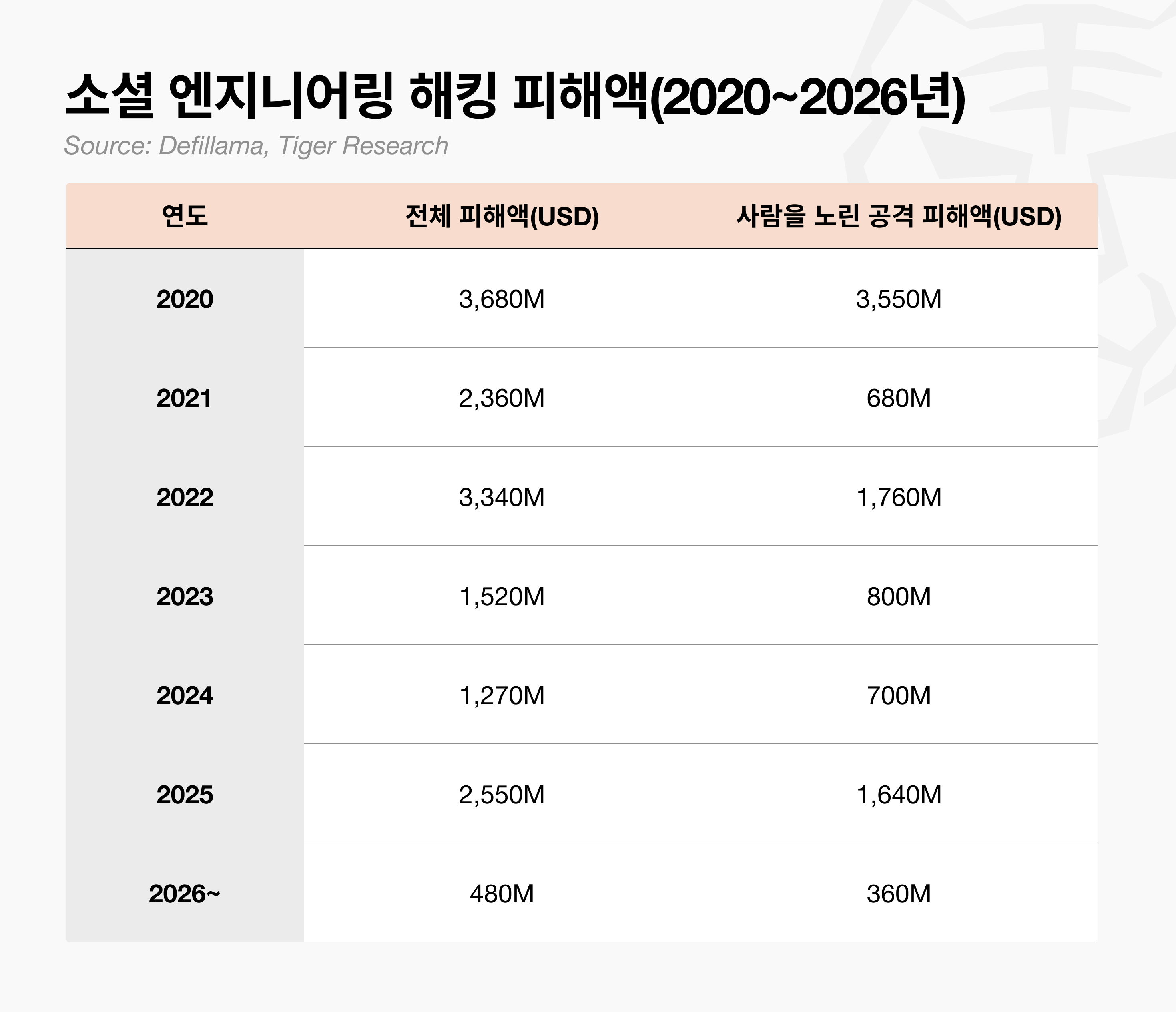 특히 소셜 엔지니어링 비중은 매년 증가해 2026년 1분기 기준 전체 해킹 피해액의 74.7%를 차지한다. 코드보다 사람이 더 쉬운 공격 경로이기 때문이다.