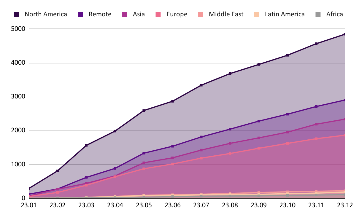 2023๋ ์ง์ญ๋ณ ์น3 ์์ฅ ์ฑ์ฉ ํธ๋ ๋๋ฅผ ์ดํด๋ณด๋ฉด, 1) ๋ถ๋ฏธ, 2) ์๊ฒฉ ๊ทผ๋ฌด, 3) ์์์, 4) ์ ๋ฝ, 5) ์ค๋, 6) ๋ผํด์๋ฉ๋ฆฌ์นด, 7) ์ํ๋ฆฌ์นด ์์ผ๋ก ๋ง์ ์ฑ์ฉ ํ๋์ด ์์๋ค. ํนํ ๋ถ๋ฏธ๋ ๊ธ๋ก๋ฒ ์ ์ฒด ์ฑ์ฉ ๊ณต๊ณ ์ค 40%๋ฅผ ์ฐจ์งํ๋ฉฐ ์ฌ์ ํ ์ํฅ๋ ฅ์ด ํฐ ์์ฅ์์ ๋ค์ ํ์ธํ ์ ์์๋ค. ๋ ์ฃผ๋ชฉํ ์ ์, ์์์ ์ง์ญ์ด ์ ๋ฝ์ ์์ ๋ ํ๋ฐํ ์ฑ์ฉ์ด ์งํ๋์๋ค๋ ์ ์ด๋ค. ์์์ ์ง์ญ์ ์ ์ฒด ์ฑ์ฉ ๊ณต๊ณ ์ค ์ฝ 20%, ์ ๋ฝ์ ์ฝ 15%๋ฅผ ์ฐจ์งํ๋ฉฐ ์ ์๋ฏธํ ์ฐจ์ด๋ฅผ ๋ณด์ธ๋ค. ๊ธ๋ก๋ฒ ์น3 ์์ฅ์์ ์์์ ์์ฅ์ ๋ํ ๊ด์ฌ์ด ๋์์ง๋ฉฐ, ์๊ฐ์ด ์ง๋จ์ ๋ฐ๋ผ ์ด ๋ ์ง์ญ ๊ฐ์ ๊ฒฉ์ฐจ๋ ๋ ๋ฒ์ด์ง ๊ฒ์ผ๋ก ์์๋๋ค.