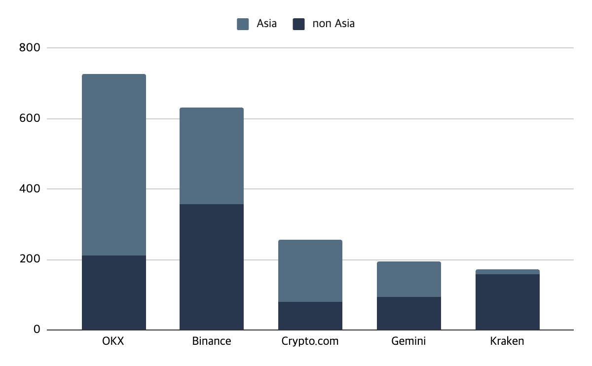 2023๋ ๊ฐ์ฅ ๋ง์ ์ฑ์ฉ์ด ๋ฐ์ํ ๊ฐ์์์ฐ ๊ฑฐ๋์๋ 1) OKX, 2) ๋ฐ์ด๋ธ์ค(Binance), 3) ํฌ๋ฆฝํ ๋ท์ปด(Crypto.com), 4) ์ ๋ฏธ๋(Gemini), 5) ํฌ๋ผ์ผ(Kraken) ์์ด๋ค. OKX๋ ๊ธ๋ก๋ฒ ํ๋ฌผ ๊ฑฐ๋์ 3์๋ฅผ ์ฐจ์งํ๋ฉฐ, ๋ฐ์ด๋ธ์ค์ ์ ๋นํธ๋ฅผ ๋งน์ถ๊ฒฉํ๊ธฐ ์ํด ์ต๊ทผ๊น์ง๋ ๊ฐ์ฅ ํ๋ฐํ ์ฑ์ฉ์ ์งํํ์๋ค. ํนํ OKX๋ ์์์ ์ง์ญ ์ ์ญ์ ๊ฑธ์ณ ์์ฅ ํ์ฅํ๋ ๋ชจ์ต์ด ์ธ์์ ์ด์๋๋ฐ, ํ์ฝฉ, ์ธ๋, ํ๊ตญ, ํธ์ฃผ, ํ๊ตญ, ๋ง๋ ์ด์์ ๋ฑ์์ ์์ฅ์ ํ๋ํ๋ ๋ชจ์ต์ด ์ธ์์ ์ด๋ค.