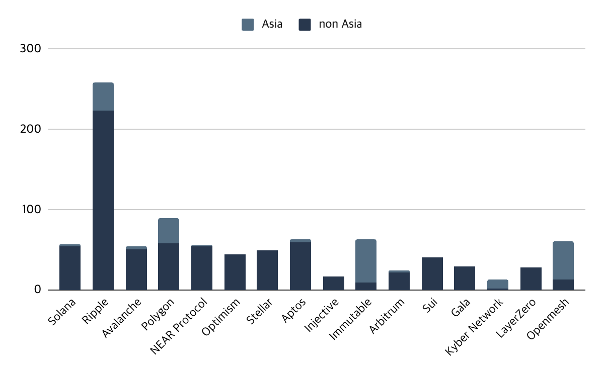 ๊ทธ ๋ค์์ผ๋ก ๊ฐ์ฅ ํ๋ฐํ ์ฑ์ฉ์ ๋ณด์ธ ๋ถ์ผ๋ โ์ธํ๋ผ์คํธ๋ญ์ณ' ์ด๋ค. ์ธ์์ ์ธ ์ ์, ์์์ ์์ฅ์ ๋ํ ๊ธฐ๋์ ๋ฌ๋ฆฌ, ์ฌ์ ํ ๋ถ๋ฏธ์ ์ ๋ฝ๊ถ ์ค์ฌ์ ์ฑ์ฉ์ด ์ด๋ฃจ์ด์ก๋ค๋ ์ ์ด๋ค. ๊ทธ๋ผ์๋, ์ด๋ค์ด ์์์ ์์ฅ ์ง์ถ์ ์ํด ํ๋ ๋ ์ฑ์ฉ์ ์์ํ๋ค๋ ์ ์ ์ฃผ๋ชฉํ ๋งํ๋ค. ์๋ฅผ ๋ค์ด ์ฌํด ์๋ผ๋(Solana), ๋ฆฌํ(Ripple), ์๋ฐ๋์ฒด(Avalanche), ์๋นํธ๋ผ(Arbitrum) ๋ฑ ์์์ ์ง์ญ์ ๋ํ ์ฑ์ฉ์ด ์งํ๋์๋ค. ์ด๋ค์ ์ฑ์ฉ์ ์ค์ ์ฌ์ ๊ธฐํ๋ฅผ ํ๋ณดํ ๋ค ์์์ ์ง์ญ์ผ๋ก ๋ ๋ง์ ์ฑ์ฉ์ด ์ด๋ฃจ์ด์ง ๊ฒ์ผ๋ก ์์๋๋ค. ์ค์ ๋ก ํด๋ฆฌ๊ณค(Polygon)์ ๊ฒฝ์ฐ, ๋ค์์ ์์์ ๊ธฐ๋ฐ ๊ธฐ์ ๋ค๊ณผ ํํธ๋์ญ ์ฒด๊ฒฐ, ์ค์ ์ฌ์ ๊ธฐํ๋ฅผ ์ฐฝ์ถํ ๋ค ์์์ ์ง์ญ์ ๋ํ ํ๋ฐํ ์ฑ์ฉ์ด ์งํ๋์๋ค.
