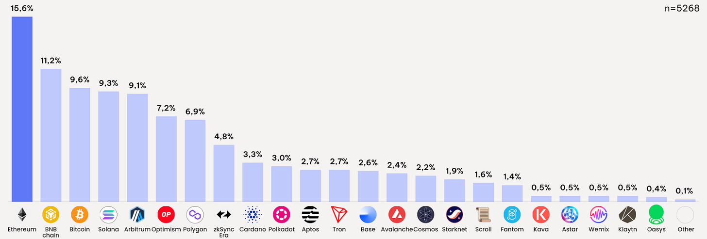 Until mid-2023, Arbitrum and Polygon were the top 3 and 4 ecosystems, but with 1) the resurgence of the inscription trend, and 2) the rise of NFTs and memecoin Bitcoin and Solana have taken their place.