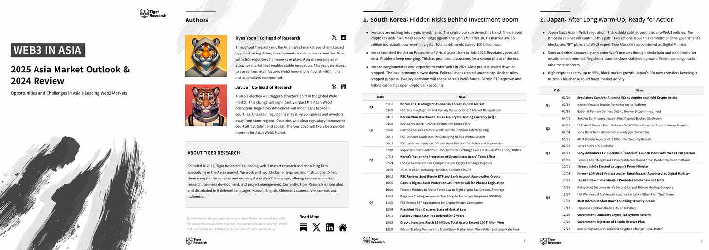 This report analyzes the evolving trends in the Asia Web3 market and highlights key opportunities and challenges for 2025. Tiger Research provides insights to help you understand upcoming changes and prepare effective strategies.