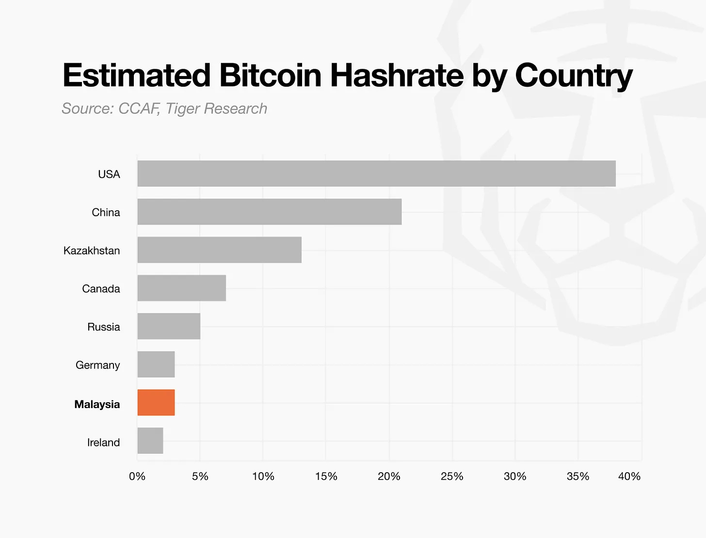 Malaysia menempati peringkat top 10 negara penambang bitcoin global berdasarkan hashrate. Fasilitas penambangan skala besar berpusat di Sarawak dan Sabah (Borneo), dengan basis operasional memanfaatkan infrastruktur pembangkit listrik tenaga air (hydro) yang luas. Kedua wilayah ini memiliki surplus pasokan listrik relatif terhadap kebutuhan. Penambangan Bitcoin secara aktif memanfaatkan kelebihan listrik ini.