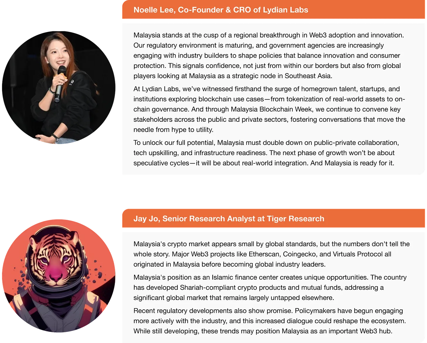 Tiger Research meposisikan diri sebagai mitra riset resmi untuk Malaysia Blockchain Week, acara blockchain utama di negara tersebut yang diselenggarakan oleh Lydian Labs. Hal yang paling menonjol dari acara ini adalah partisipasi aktif otoritas regulasi, yang sebelumnya bersikap konservatif terhadap industri kripto, namun kini terlibat dalam diskusi konstruktif untuk pengembangan industri.