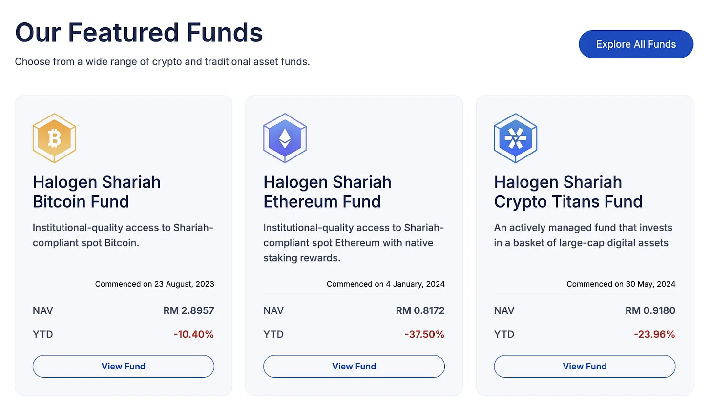 Berbagai produk kripto berbasis keuangan Islam telah muncul, seperti Halogen Capital adalah manajer reksadana kripto Syariah-compliant pertama di dunia, mengelola sekitar USD 75 juta dalam berbagai produk seperti dana Bitcoin Syariah, Ethereum, dan lainnya.