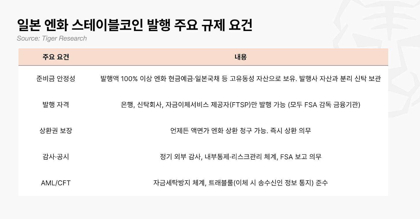 특히, 발행 자격은 은행, 신탁회사, 자금이체서비스 제공자(FTSP) 등 금융청 인가를 받은 세 사업자 유형으로만 제한된다. 이들만이 새로운 스테이블코인을 생성(mint)하고 소각(burn)하며, 100% 준비금을 신탁 보관할 책임을 진다.