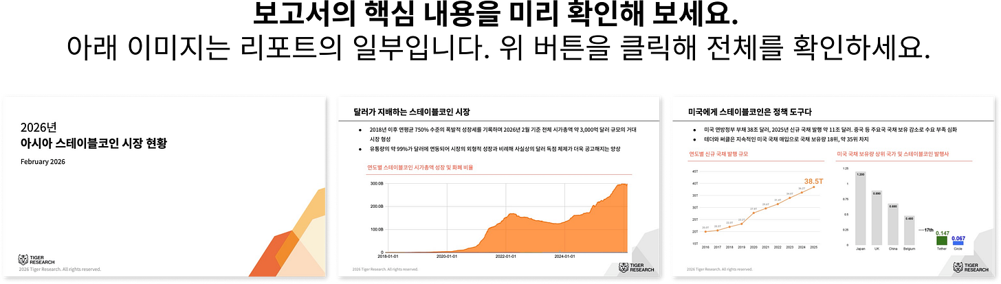 결국 미국 정부 입장에서 달러 스테이블코인은 새로운 디지털 결제 수단이기도 하지만, 국채 판매 채널이자 달러 패권을 유지하는 정책 도구이기도 하다.