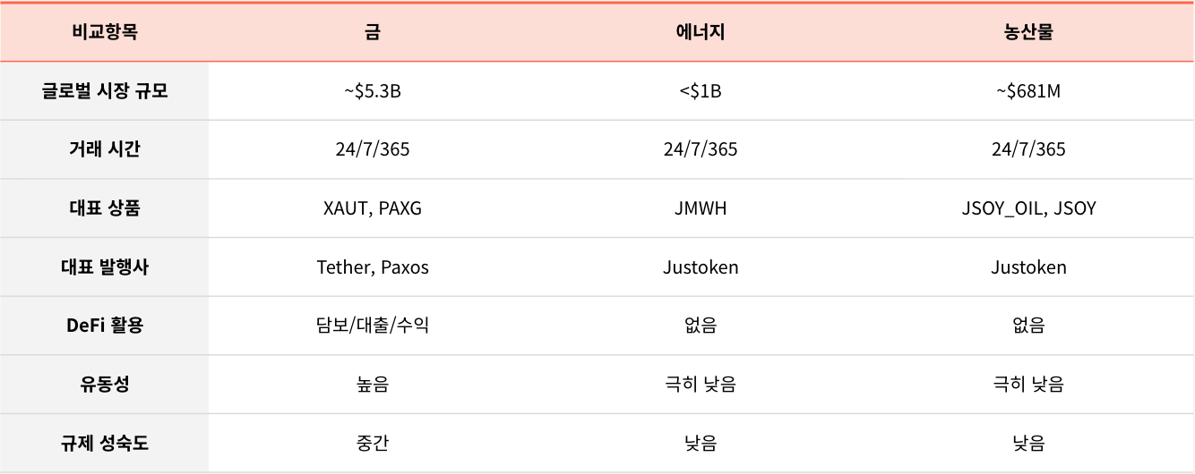 농산물: JSOY_OIL($300M)이 대두유 1톤 = 1토큰 구조를 제시했으나, 온체인상 Mint/Burn만 확인될 뿐 실질 거래는 부재