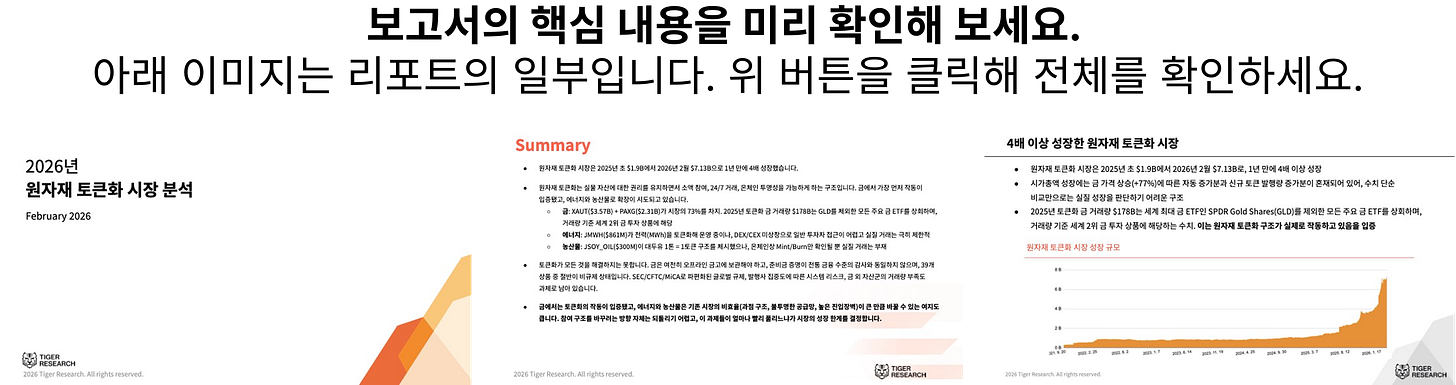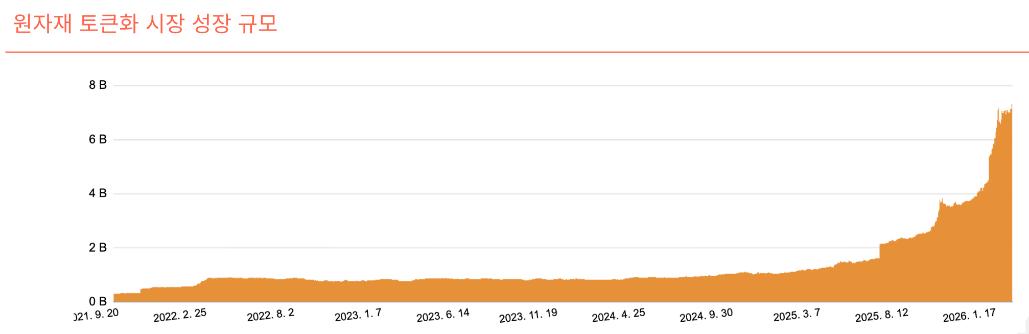 원자재 토큰화 시장은 2025년 초 $1.9B에서 2026년 2월 $7.13B으로 1년 만에 4배 성장했습니다.