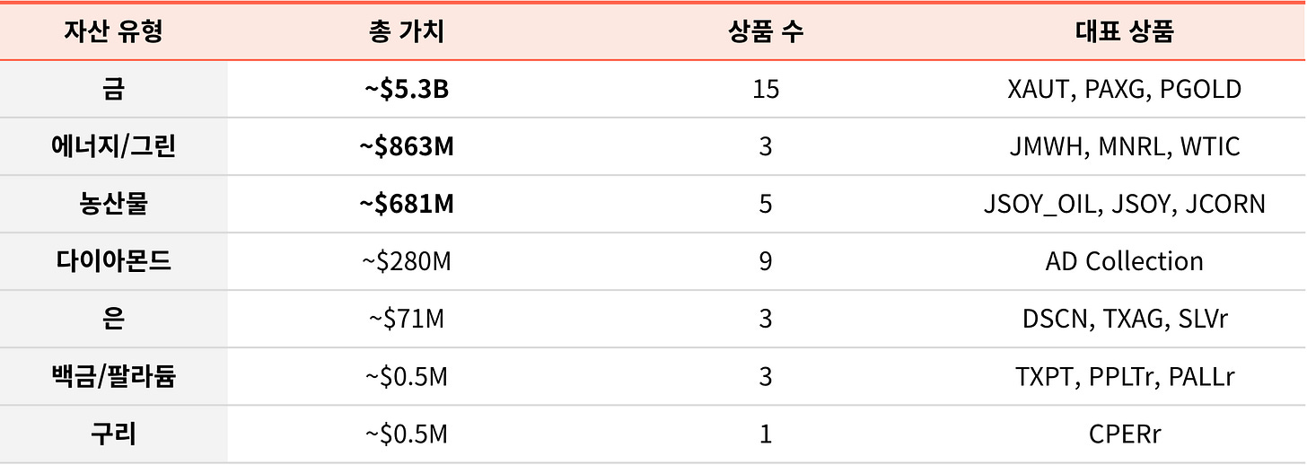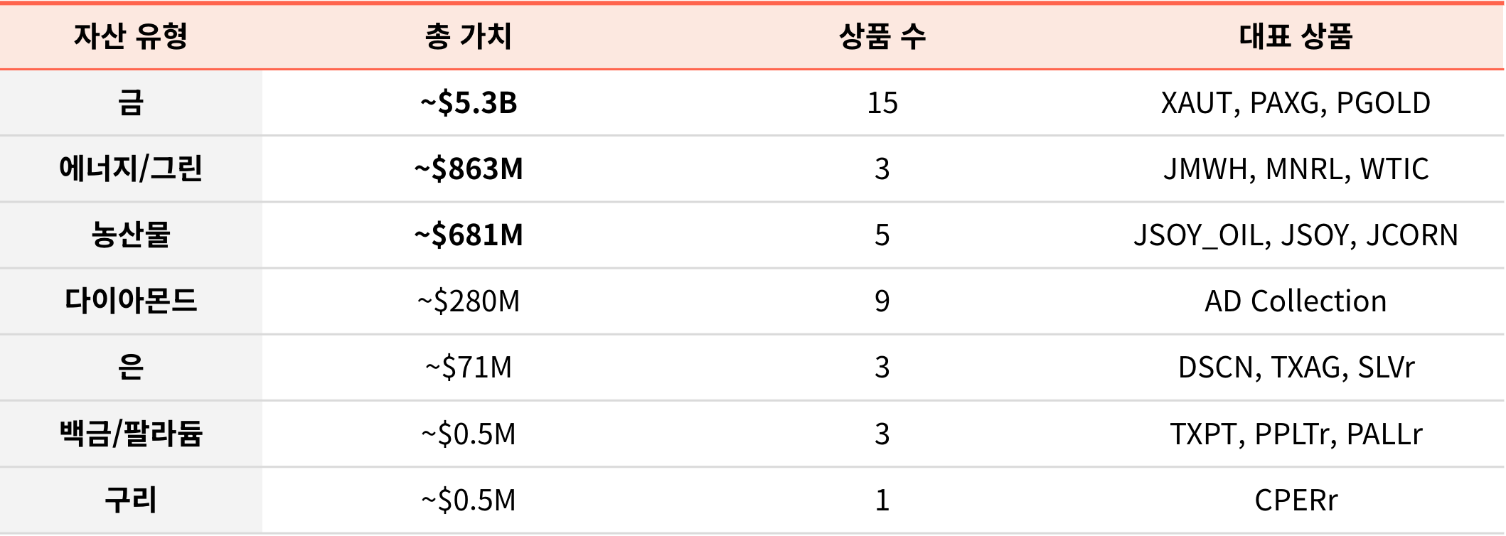 금: XAUT($3.57B) + PAXG($2.31B)가 시장의 73%를 차지. 2025년 토큰화 금 거래량 $178B는 GLD를 제외한 모든 주요 금 ETF를 상회하며, 거래량 기준 세계 2위 금 투자 상품에 해당