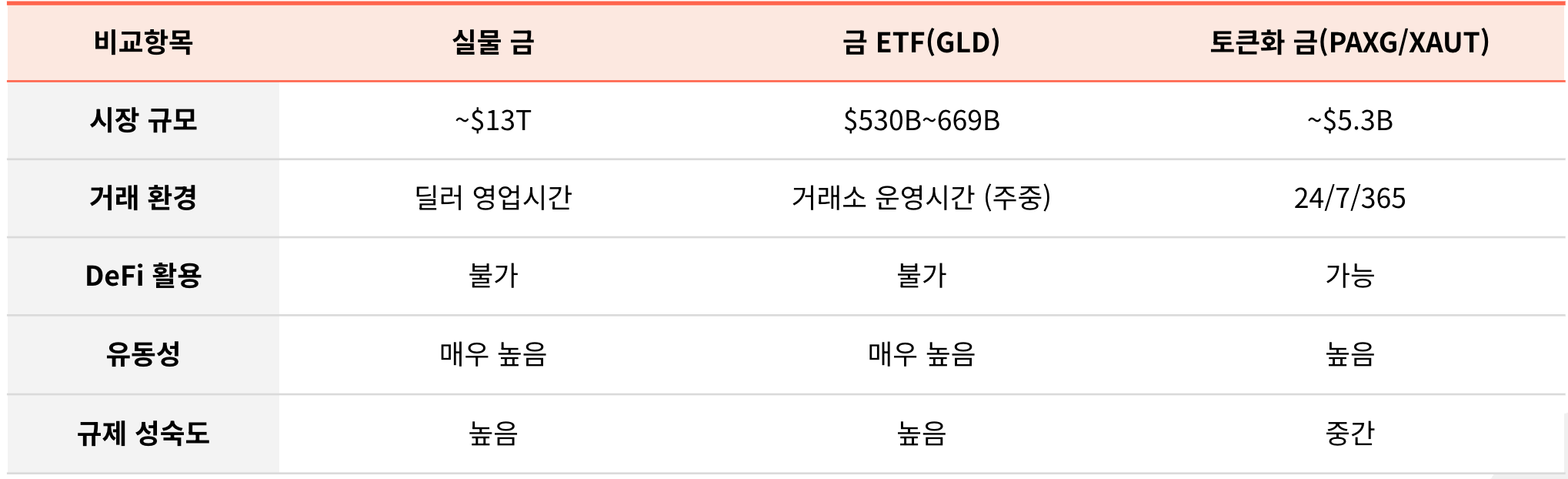 2025년 토큰화 금 거래량 $178B는 세계 최대 금 ETF인 SPDR Gold Shares(GLD)를 제외한 모든 주요 금 ETF를 상회하며, 거래량 기준 세계 2위 금 투자 상품에 해당하는 수치. 이는 원자재 토큰화 구조가 실제로 작동하고 있음을 입증