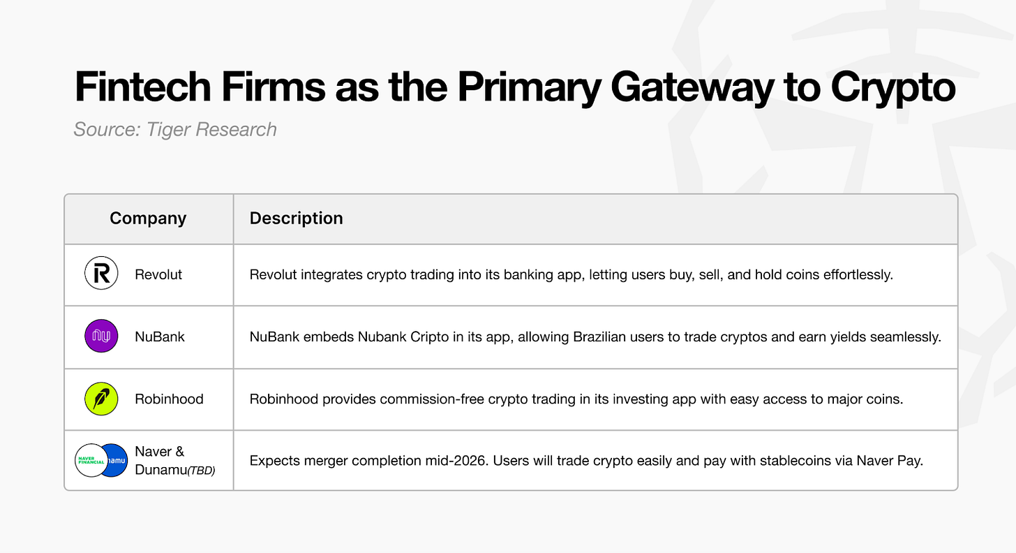 암호화폐 관련 규제가 명확해짐에 따라 접근성이 높은 핀테크 앱 내 암호화폐 거래가 일반화되고 있다. 이제 새로운 사용자는 낯선 거래소 앱을 새로 설치할 필요가 없다. 대신 일상에서 늘 사용하는 핀테크 앱을 통해 간편하게 암호화폐를 거래하면 된다. 이제는 핀테크 서비스들의 시대이다.