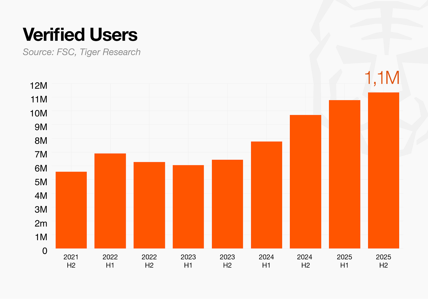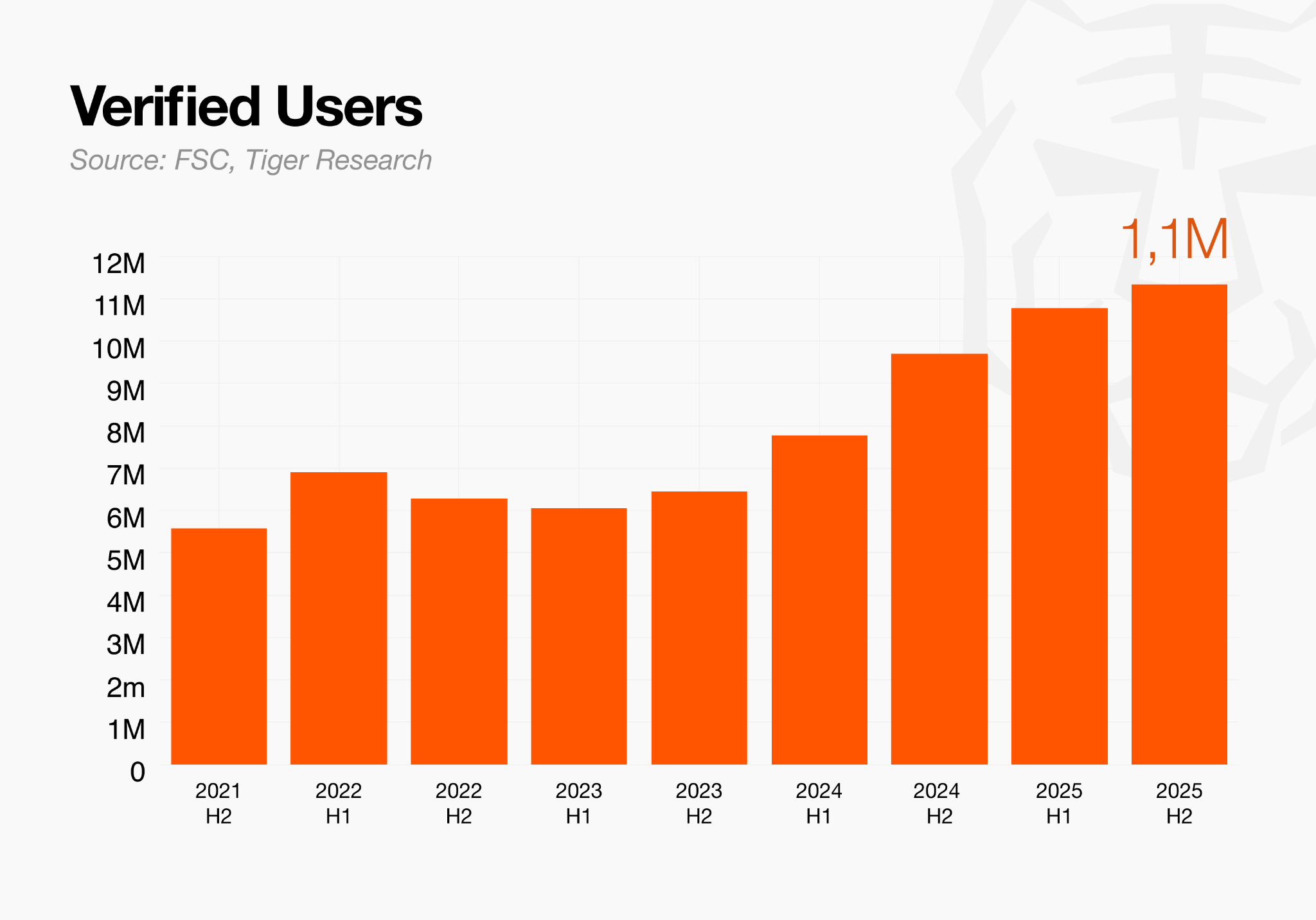 Domestic crypto trading is centered on KRW-denominated exchanges. As of end-2025, the number of verified users reached 11.33 million, an all-time high. Growth, however, is slowing. After peaking at 24.7% in H2 2024, the growth rate fell to 11% in H1 2025 and 5.2% in H2 2025. The pool of new entrants is shrinking.