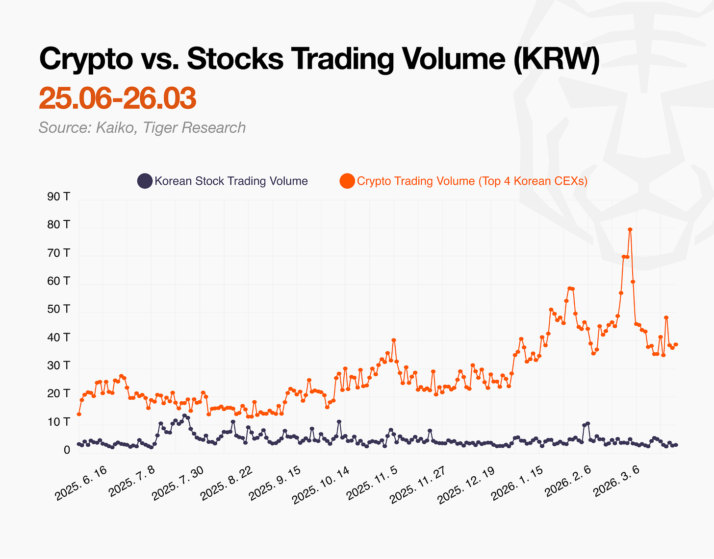 Over the same period, a widening gap emerged between crypto trading volume and equity market turnover. The divergence has become particularly acute since early January this year. This is not a loss of interest in crypto. It is the result of investors having more options.