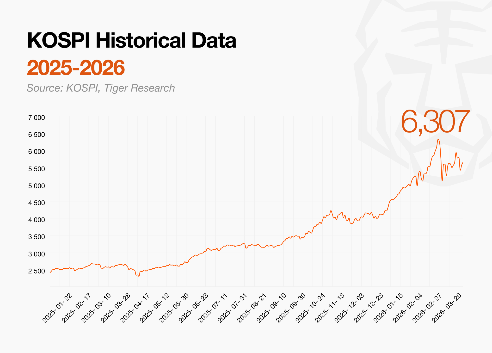 The backdrop is a bull run in equities. The KOSPI started January 2025 at roughly 2,400 and broke through 6,300 in February 2026, more than doubling in just over a year.