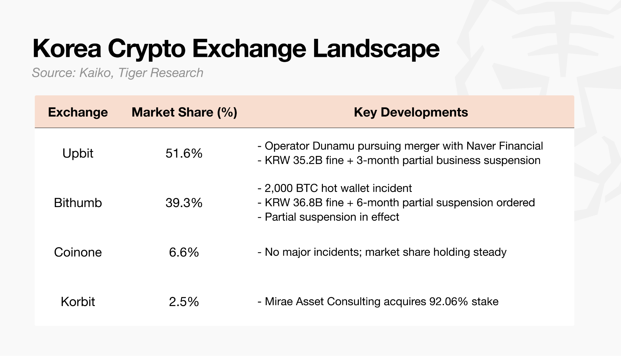 Korea’s domestic crypto exchange market remains firmly structured around two players: Upbit and Bithumb. Together they hold approximately 87% market share, with Coinone trailing at around 10%. Recently, simultaneous regulatory pressure and M&A activity have begun to shake the structure itself.