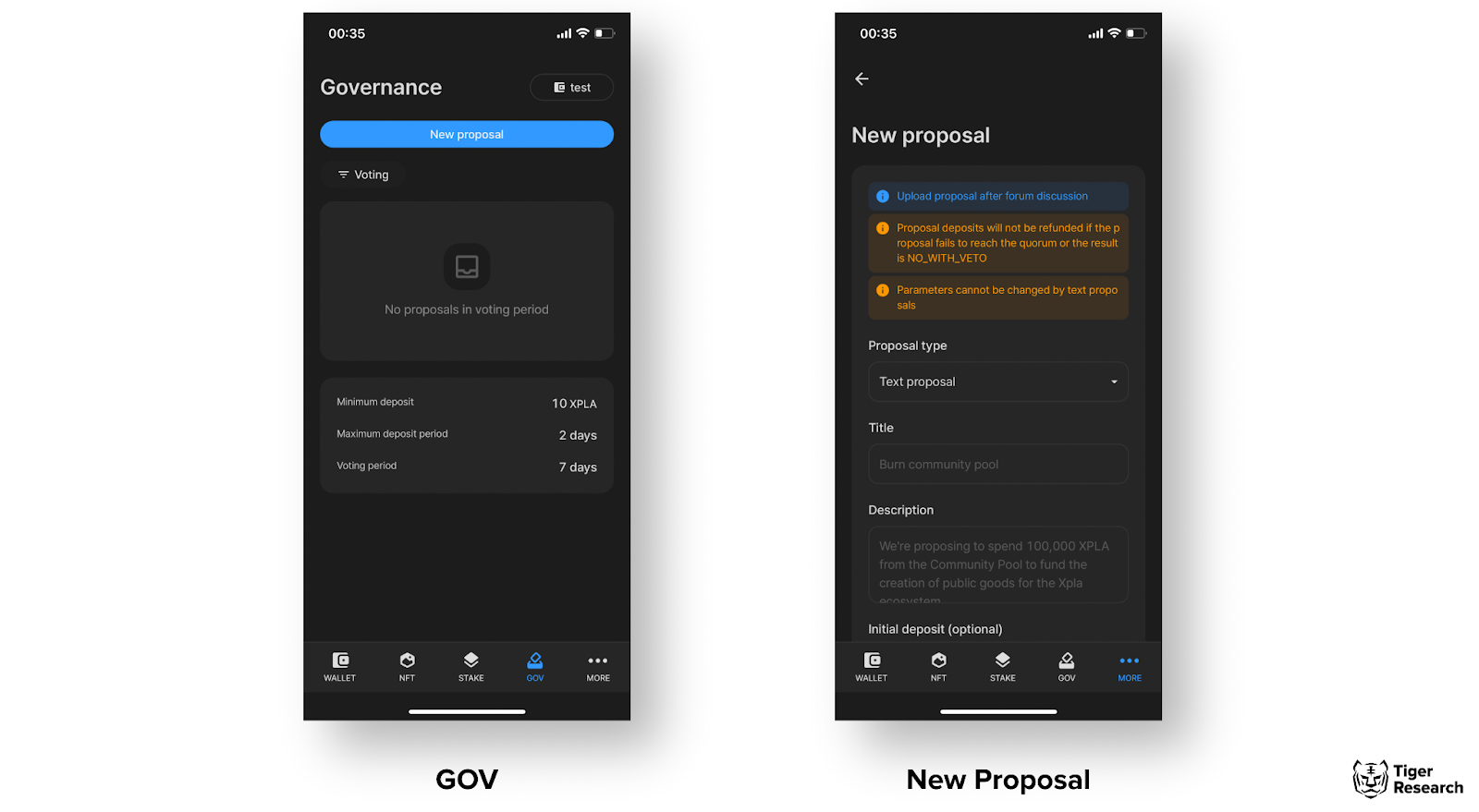 XPLA는 여타 서비스와 다르게 XPLA Chain에 참여할 수 있는 거버넌스 체계를 블록체인 지갑 내에 도입했다. 10 XPLA를 예치한 뒤 유저는 제안을 할 수 있으며, 7일 내 일정 기준을 달성할 시 프로토콜 자체에 변화를 줄 수 있는 기능이다. 하나의 탭을 할애했다는 것은 메인 기능으로 활용한다는 것인데, 게임을 즐기는 유저들이 쉽게 쓸 수 있는 기능인지 의문점이 남는다.