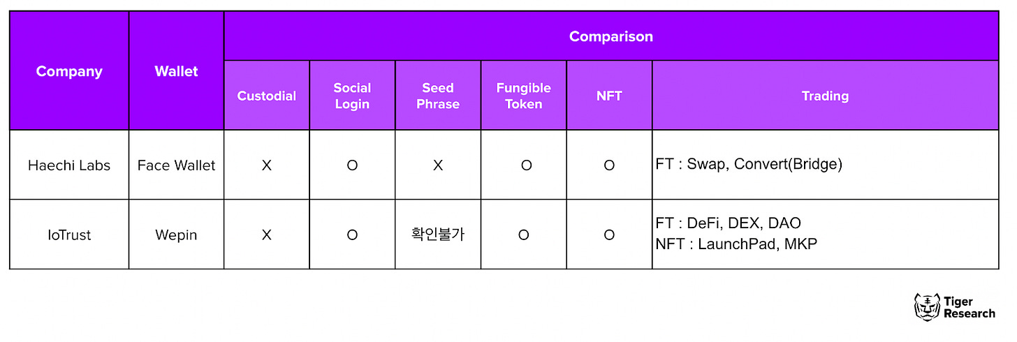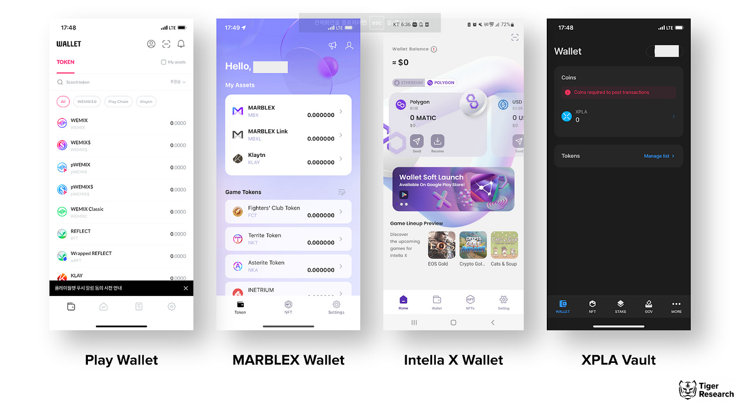 앞선 1편에서 살펴본 게임사 중 위메이드를 포함한 4개의 게임사에서 자체 블록체인 게임 플랫폼을 운영하고 있으며, 각 플랫폼 내 서비스 중 하나로 블록체인 지갑을 포함하여 서비스하고 있다. 이들은 주로 블록체인 게임을 자체 플랫폼에 온보딩시킨 뒤, 해당 게임에 지갑을 연결시켜 지갑 내에서 게임 토큰과 자체 토큰의 스왑 등의 거래를 목표로 한다.
