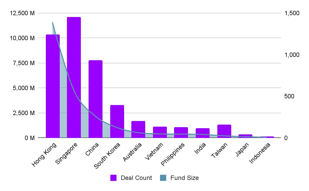 The top 80 list of crypto VCs based in the APAC region by deal count shows the most active investment activity in 1) Singapore, 2) Hong Kong, and 3) China. Singapore and Hong Kong have maintained their status as financial hubs in the crypto market, while China has also recorded a high number of investments. This is likely related to the size of their economies, along with governments’ positive stance towards Web3 companies and the regulatory environment surrounding them.