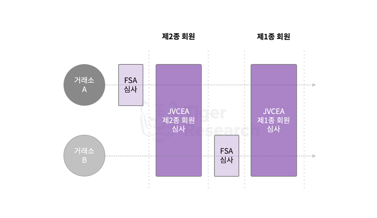 일본 내 가상자산 거래소를 운영하기 위해서는 두 가지 필수 조건이 요구된다. 우선, 6개월에 걸친 1) FSA 심사를 통과해야만 하며, 2) JVCEA에서 발급하는 가상자산 사업자 라이센스 중에서도 ‘제1종 회원'을 취득해야만 한다.