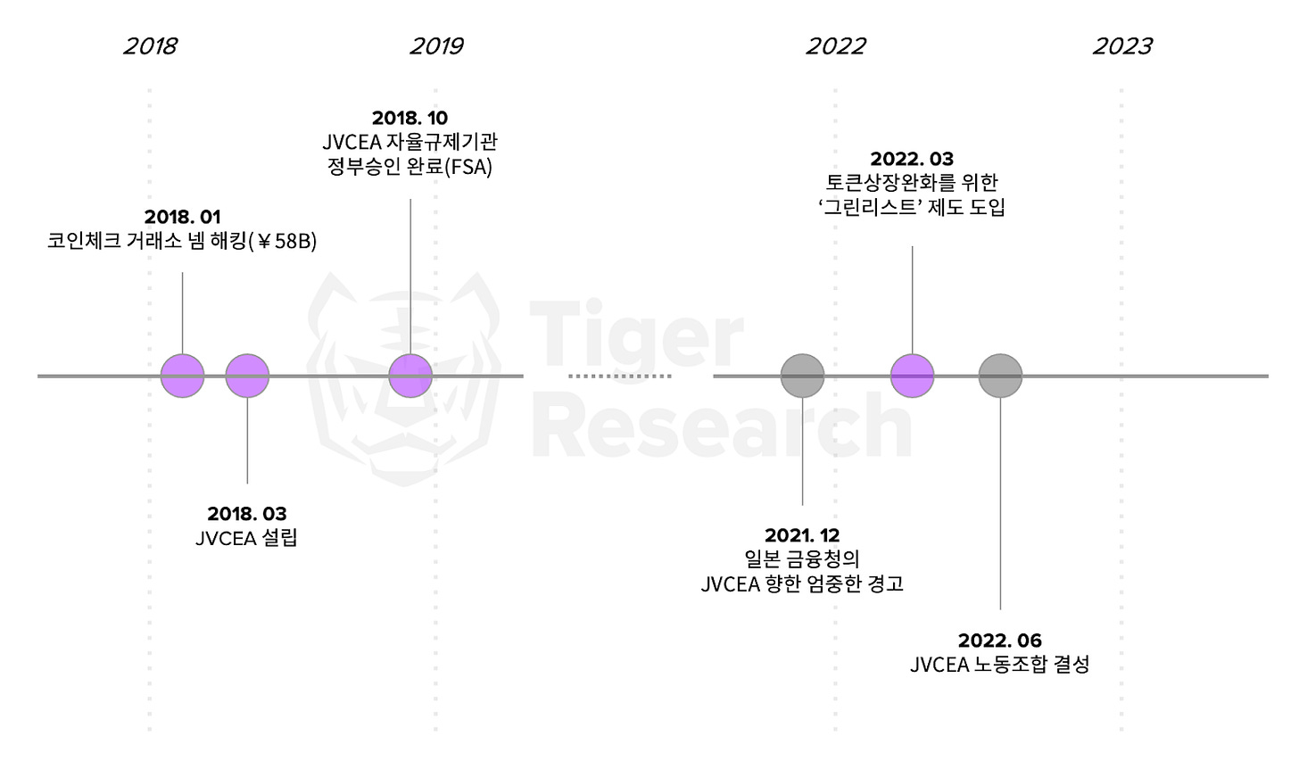 각 국의 가상자산 자율규제 기구는 일련의 가상자산 관련 사건, 사고 이후 설립되었다. 우선 일본의 경우 2018년 1월 일본 최대 가상화폐 거래소 코인체크 해킹 사건 발생한 뒤, 한국의 경우 2022년 5월 테라·루나 사태 등 가상자산 시장 내 악재가 발생하며 본격적으로 자율규제 기구 구성에 대한 구체적 논의가 이루어지기 시작하였다.