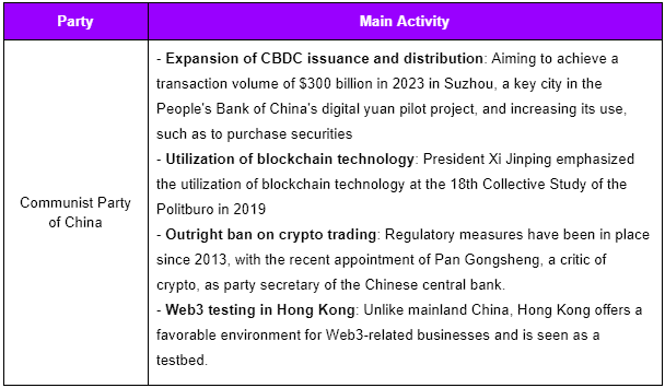 China is a one-party state, which means that the CCP is the dominant party in the state organization. In this system, the CCP determines the country's major policy directions, which have a direct impact on the country's politics, economy, and society as a whole. While there is a formal opposition, it is largely a fringe party and has little real political influence. Therefore, unlike Japan, it is difficult for China to change its political stance. This may have contributed to the lack of significant change in China's attitude towards blockchain and cryptocurrencies so far.