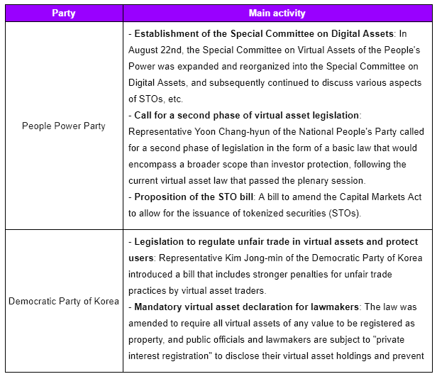 The activity of the People Power Party is centered around the Digital Asset Task Force, which is led by Representative Yoon Chang-hyun. Since the task force’s establishment, it has been discussing various areas such as STOs, and is leading practical changes such as proposing some amendments to the Capital Market Act for STOs.