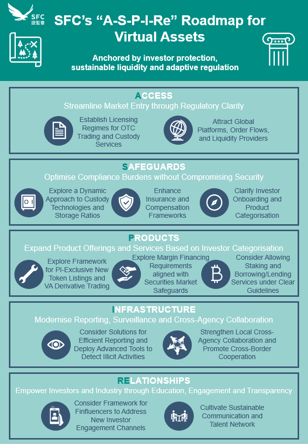 In February, the Securities and Futures Commission (SFC) unveiled the "A-S-P-I-Re" roadmap, a strategic framework aimed at enhancing Hong Kongās virtual asset market. This roadmap focuses on five key pillars: Access, Safeguards, Products, Infrastructure, and Relationships. Its 12 initiatives include plans to establish licensing regimes for over-the-counter (OTC) trading desks and custody service providers, as well as consultations on permitting crypto derivatives trading and margin lending within a regulated environment.