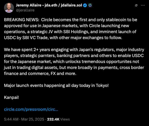 Japan also made progress on the stablecoin front. In a key infrastructure move, Circle partnered with SBI Holdings to bring USDC to Japan ā making it the first foreign-issued stablecoin to operate under the countryās 2023 stablecoin law. SBIās exchange also became the first licensed Electronic Payment Instruments Exchange Service Provider supporting foreign stablecoins.