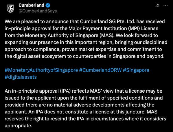 Hex Trust received a Major Payment Institution (MPI) license from the Monetary Authority of Singapore (MAS), allowing it to offer cross-border crypto transfer services. Around the same time, Cumberland SG, the Asia division of U.S.-based trading firm Cumberland, secured in-principle approval for its MPI license, adding to the list of institutional players that are deepening their presence in Singapore.