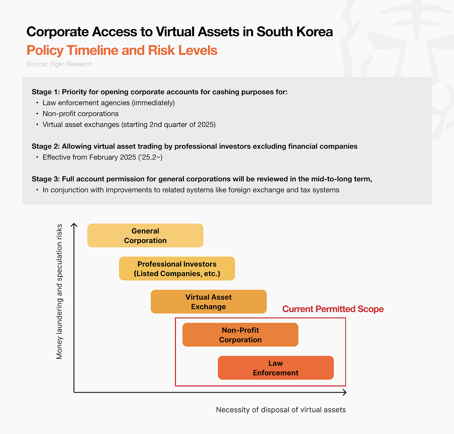 South Korea made some quiet but important moves on the regulatory front in Q1 2025. One of the most anticipated was a loosening of the corporate crypto trading ban. The Financial Services Commission (FSC) announced that certain approved entities ā like law enforcement agencies, universities, and nonprofits ā can now sell their crypto holdings to convert them into cash. However, these institutions still face restrictionsāthey are allowed to sell digital assets but cannot purchase them. This isnāt a full reopening ā itās more like a narrow off-ramp for institutions holding crypto from earlier programs or donations.