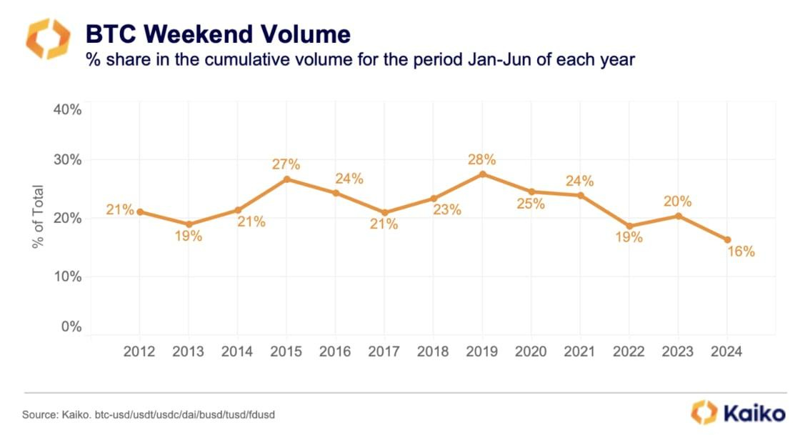 BTC 주말 거래량 비중은 2021년 이후 지속적으로 감소해 왔습니다. 이러한 하락 추세는 현물 ETF 도입 이후 더욱 가속화되었습니다. 2024년 현재 BTC 주말 거래량은 전체의 16%에 불과해, 2019년 최고치였던 28%에서 12% 포인트나 감소했습니다. 이는 사상 최저치로, 비트코인 현물 ETF의 출현이 주중과 주말 거래량 격차 확대에 상당한 영향을 미쳤음을 시사합니다.
