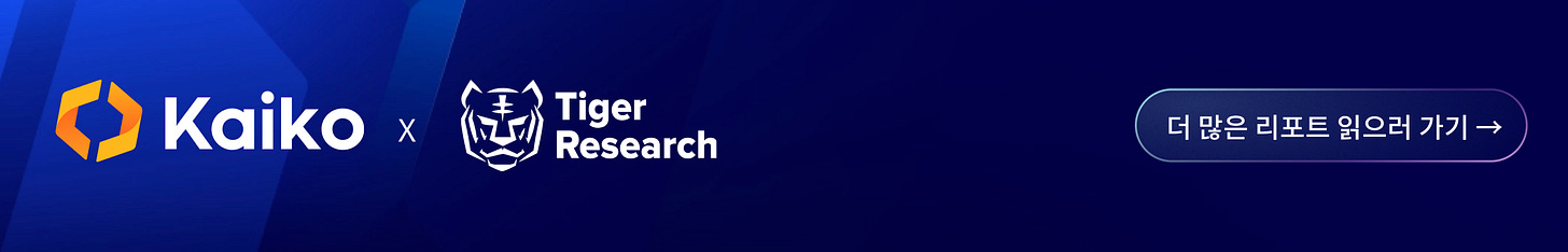 본 보고서는 카이코(Kaiko)로부터 일부 지원을 받아 타이거리서치가 한국어로 번역한 것입니다. 번역 과정에서 원문의 의미를 최대한 정확하게 전달하고자 노력했으나, 번역상의 오류나 의미의 차이가 있을 수 있습니다. 본 번역본은 정보 제공 목적으로만 제작되었으며, 투자 권유나 금융 자문으로 해석되어서는 안 됩니다. 투자 결정을 내리기 전에는 반드시 원문을 참조하시고 전문가의 조언을 구하시기 바랍니다. 타이거리서치는 본 번역본의 정확성, 완전성, 시의성을 보장하지 않으며, 이 번역본을 이용함으로써 발생할 수 있는 어떠한 손실이나 손해에 대해서도 책임을 지지 않습니다. 카이코의 원문에 포함된 모든 면책조항, 위험 경고, 이해상충 관련 공시사항은 본 번역본에도 동일하게 적용됩니다.