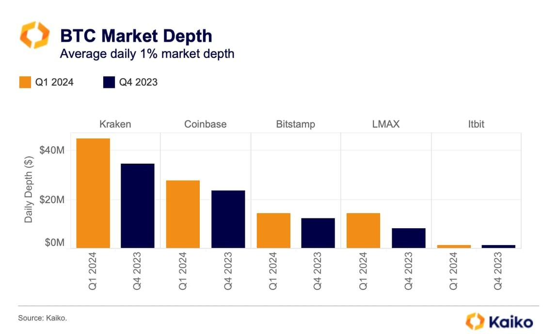 실제로 2024년 1분기에는 미국 거래소의 일일 평균 BTC 1% 시장 심도(Market Depth)가 증가했으며, 특히 기관 거래자 중심의 LMAX 거래소에서 가장 큰 증가율을 보였습니다.
