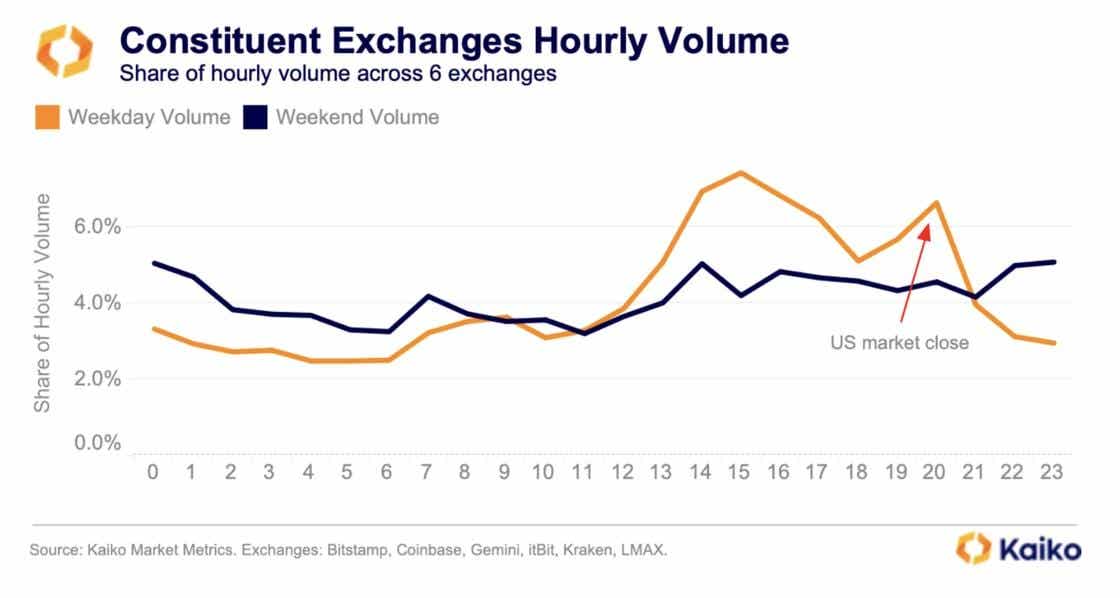 이러한 경향은 비트코인 벤치마크 구성 거래소의 평일과 주말 거래량 비중을 비교하면 더욱 뚜렷이 나타납니다. 평일, 특히 미국 시장 마감 시간대에 발생하는 거래량이 벤치마크 거래소 전체 거래량의 6.6% 이상을 차지합니다. 반면 주말에는 이 수치가 4% 정도로 떨어지며, 뚜렷한 거래 패턴이나 특정 시간대에 거래가 집중되는 현상이 나타나지 않습니다.