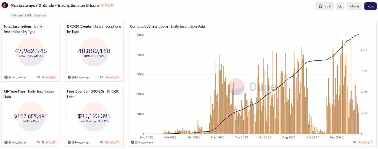 截至 2023 年底,已创建超过 5280 万笔 Ordinals 铭文,到 2024 年底增长至约 6970 万笔。与此同时,矿工收取了数亿美元的费用,截至 2024 年第三季度,费用超过 6900 枚 BTC(约 4.05 亿美元)。