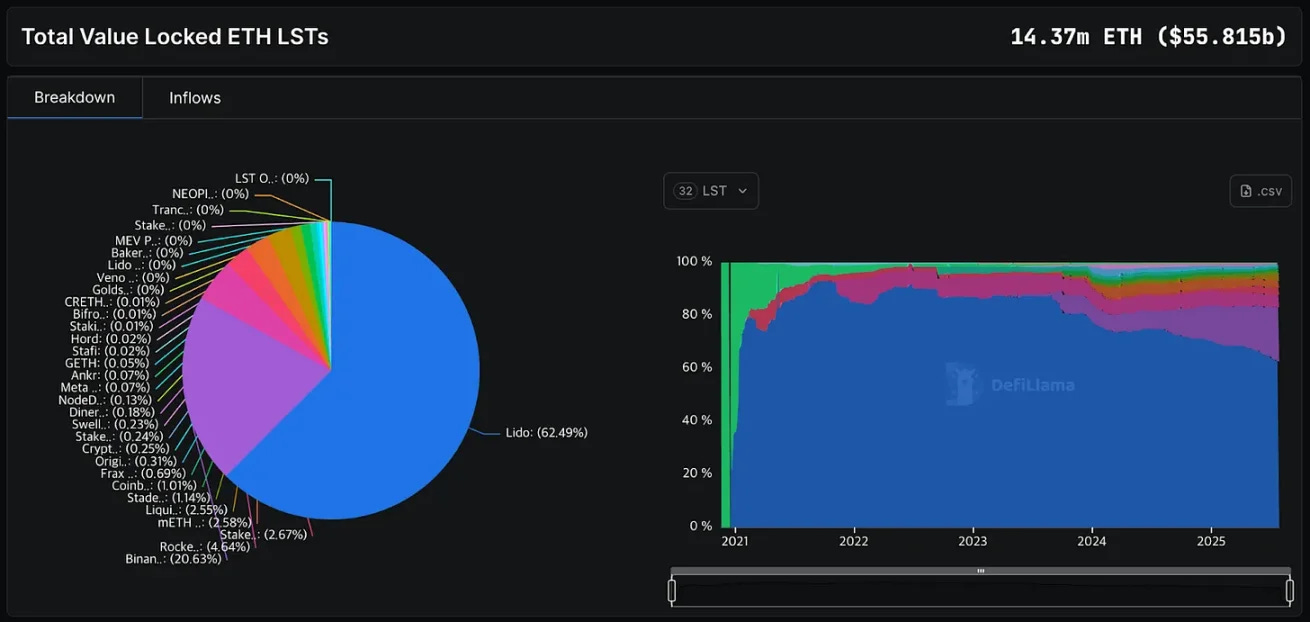 这与以太坊形成鲜明对比,以太坊上有大量 ETH 被积极部署于 DeFi 和质押中。例如以太坊上的流动性质押协议已锁定超过 1437 万枚 ETH(约 560 亿美元),将 ETH 转化为生息资产,并推动了一个充满活力的链上经济。