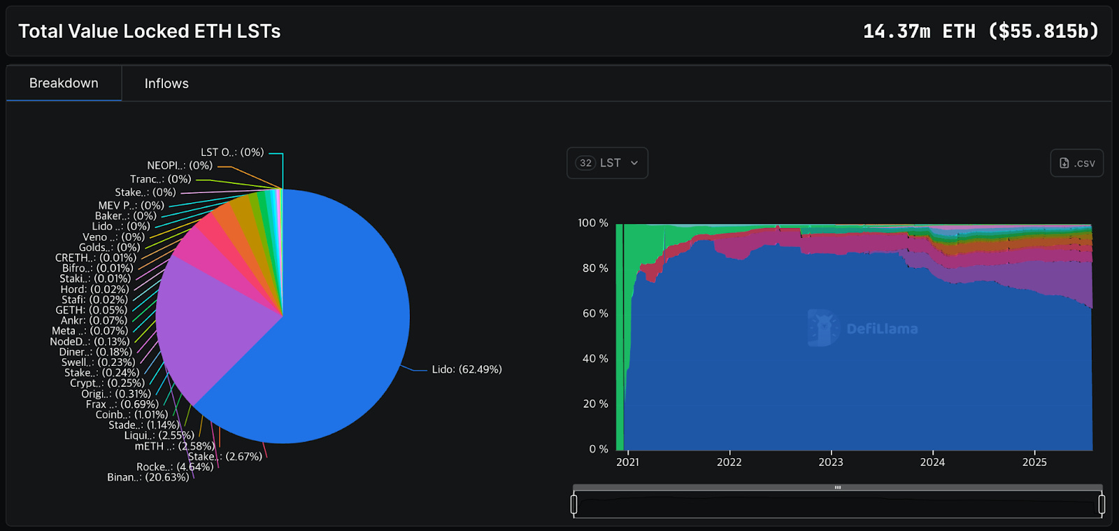 This stands in stark contrast to Ethereum, where a huge portion of ETH is actively deployed in DeFi and staking. For example, liquid staking protocols on Ethereum have locked over 14.37 million ETH (~$56 billion), turning ETH into a yield-bearing asset and driving a vibrant on-chain economy.