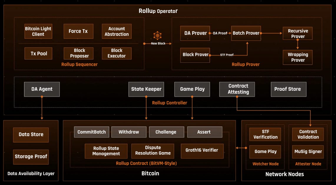 It batches off-chain transactions, generates ZK proofs of state transitions, and posts those proofs to Bitcoin L1 for finality. To handle data availability (which Bitcoin cannot provide natively), Merlin uses a Data Availability Committee (DAC) composed of oracle nodes that store and attest to the off-chain data. In its proposed architecture, these DAC nodes must stake BTC and are slashed if they sign off on invalid state updates that are later disputed.