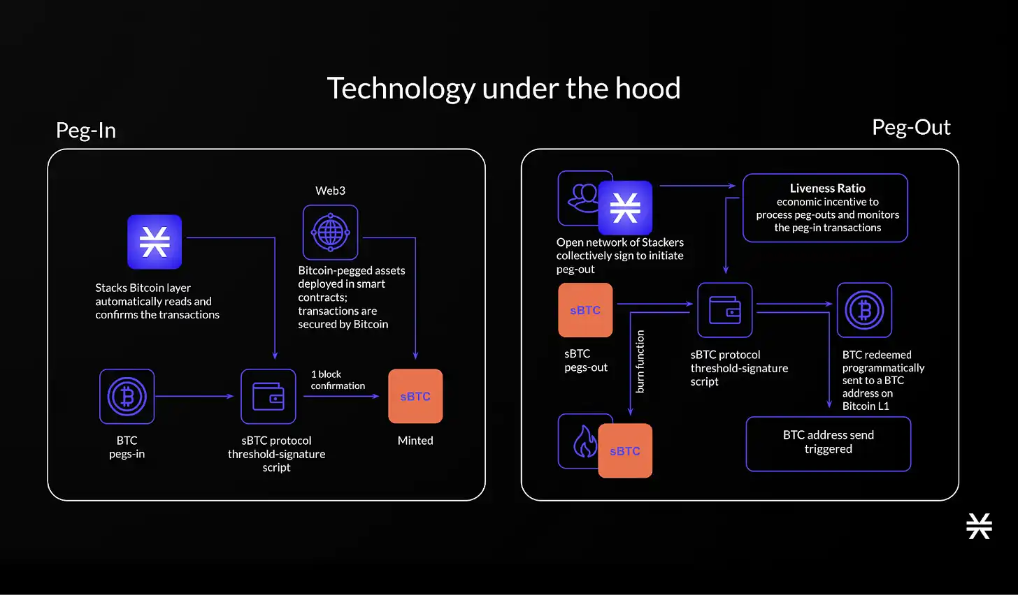 For peg-outs, the process of converting wrapped Bitcoin back to original Bitcoin, an open network of "Stackers" jointly sign to convert sBTC back into native BTC.