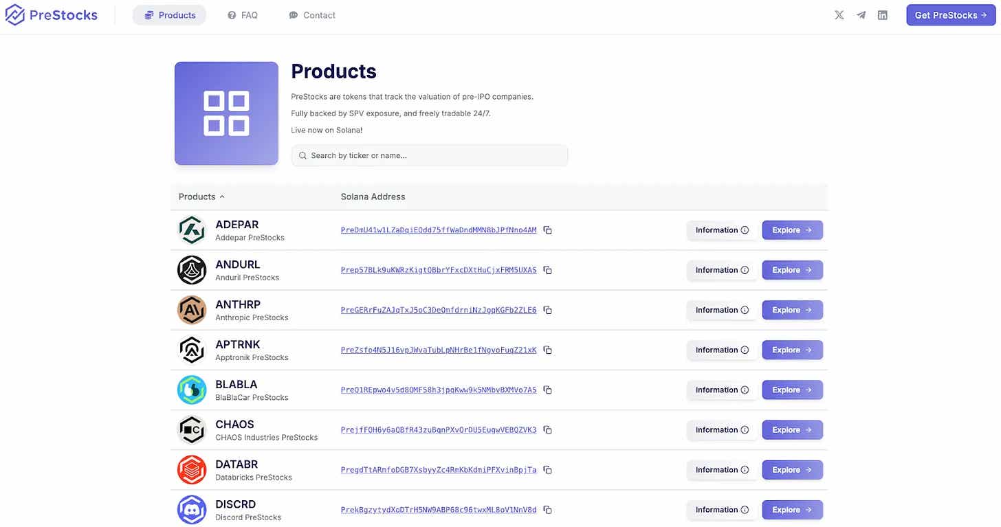 PreStocks mengadopsi model yang mirip dengan Jarsy, yakni membeli saham perusahaan privat dan menerbitkan token dengan jaminan aset 1:1. Platform ini saat ini mendukung perdagangan 22 saham pra-IPO dan baru-baru ini meluncurkan produknya ke publik.
