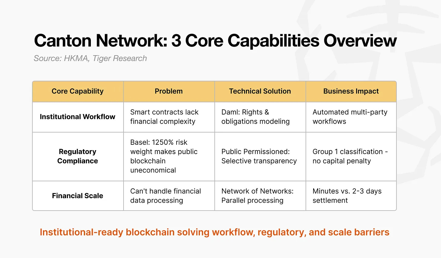 Canton Network 通过 Canton 协议实现差异化,该协议使机构能够满足监管要求并管理风险,同时保留区块链的实时结算和资本效率优势。这使其成为支持从试点项目过渡到大规模机构采用的基础设施。