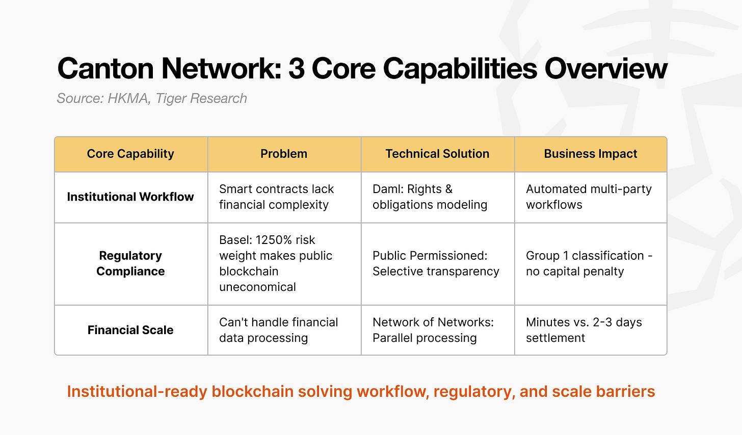 Enables Selective Transparency Architecture: “Public permissioned” model with Daml smart contracts allows transaction-level privacy control, meets Basel regulatory standards, and supports institutional-grade workflows through rights-and-obligations framework.