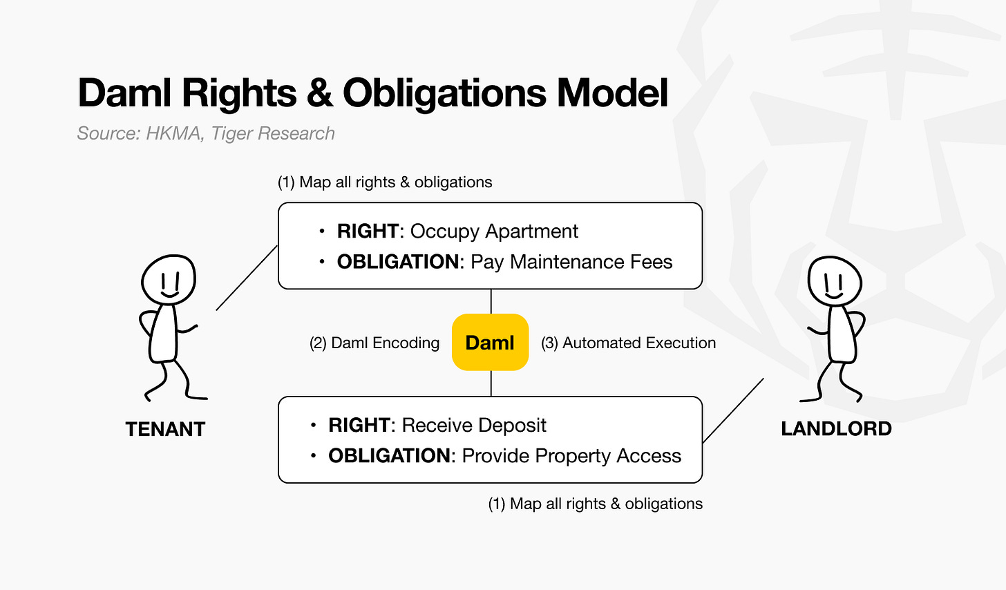Daml은 ‘권리와 의무’ 관점에서 계약을 설계해 금융기관 맞춤형 실무 환경을 제공한다. 권리와 의무의 교환은 기본적으로 금융 거래의 본질이기 때문이다. 구체적인 예를 들어보자. 아파트 전세 계약에서 임차인은 아파트에 살 권리가 있지만 관리비를 낼 의무가 있다. 반대로 임대인은 전세금을 받을 권리가 있지만 아파트를 사용할 수 있게 해줄 의무가 있다. Daml은 이런 복잡한 관계를 코드로 정확하게 표현할 수 있다.