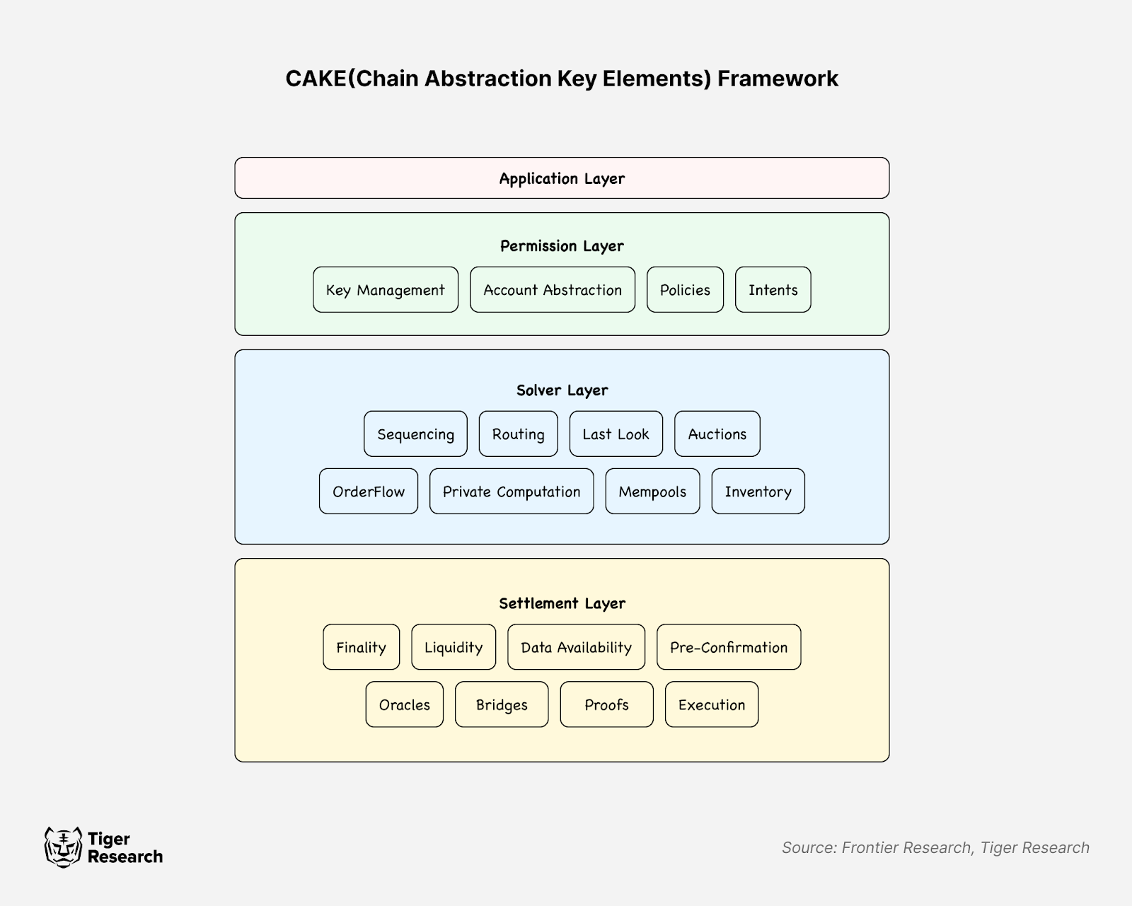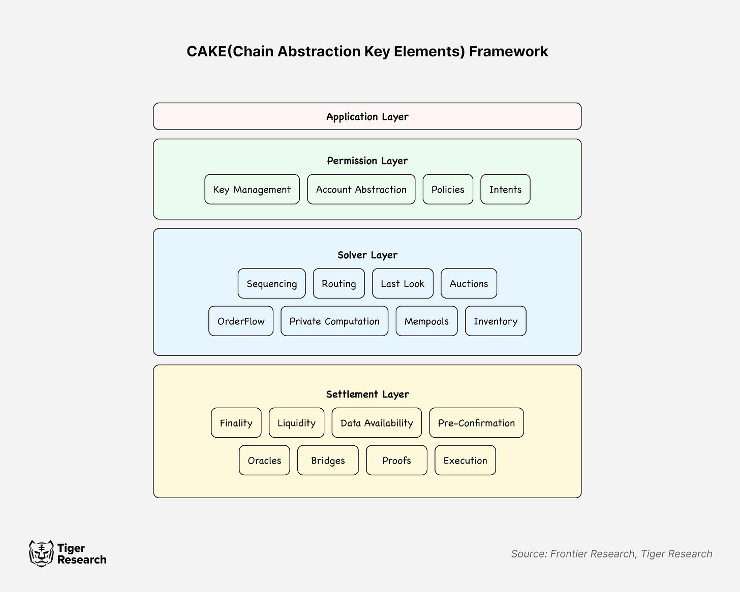 그렇다면 이런 문제를 어떻게 해결할 수 있을까? 이러한 문제를 해결하기 위해서 파티클 네트워크를 포함해 많은 프로토콜에서 이러한 문제를 모두 혹은 일부를 해결하고자 하고 있다. Frontier Research에서는 이를 직관적으로 이해할 수 있도록 CAKE Framework를 제안했다. 이 프레임워크는 크게 세 계층으로 구성된다.