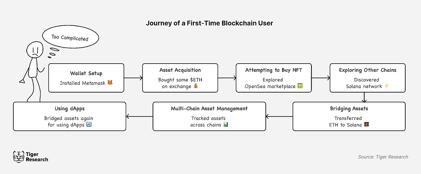 이처럼 사용자는 개인 키 관리의 중요성, 가스비 개념, 다른 체인으로의 자산 이동 등 새로운 지식을 연이어 습득해야 한다. 사례처럼 여러 체인에 걸친 자산 관리와 디앱 사용은 더욱 복잡한 문제다.