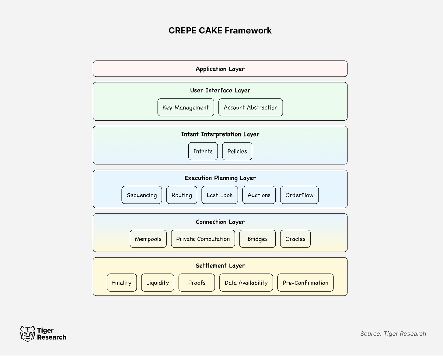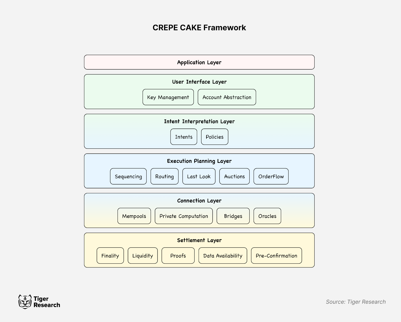 하지만 이 구조는 블록체인 생태계에 익숙하지 않은 사람들에게는 여전히 이해하기 어려울 수 있다. 이에 타이거리서치에서는 CAKE Framework를 더 세밀하게 나눠 해당 프레임워크를 보다 쉽게 이해할 수 있는 CREPE CAKE Framework를 제안한다.