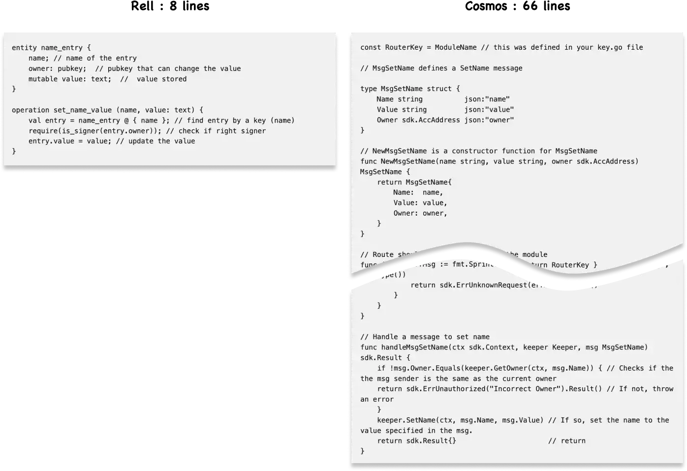 One of the key features of Rell is its code simplicity. When defining data models, Rell offers up to 7x more compact syntax compared to SQL. Additionally, compared to languages on other blockchain platforms, Rell requires significantly less code to implement the same functionality. This conciseness contributes to faster development times, more readable code, and reduced chances of errors. These benefits are especially pronounced when developing complex blockchain applications, enabling developers to implement more functionality with less code, thereby significantly increasing productivity.